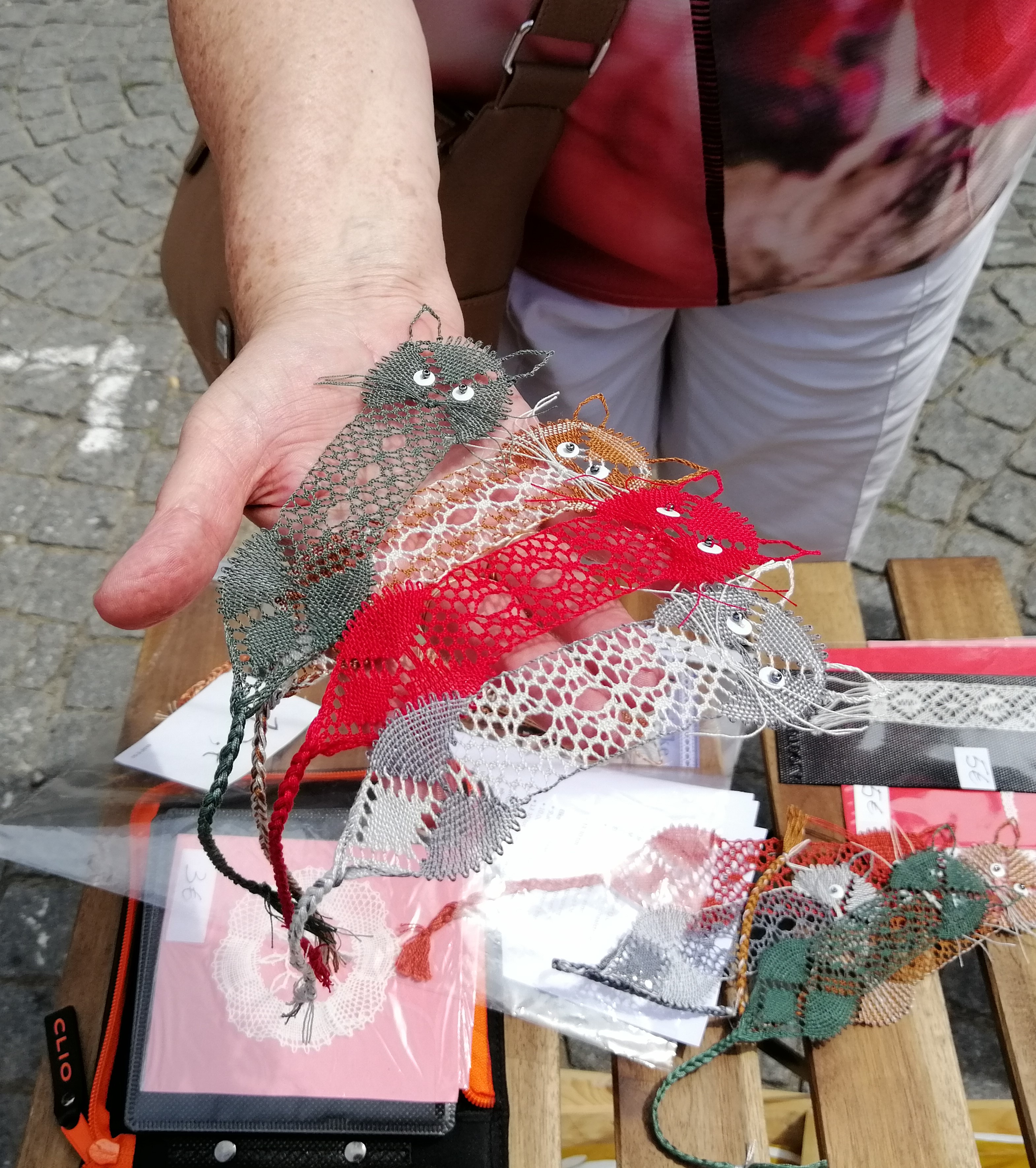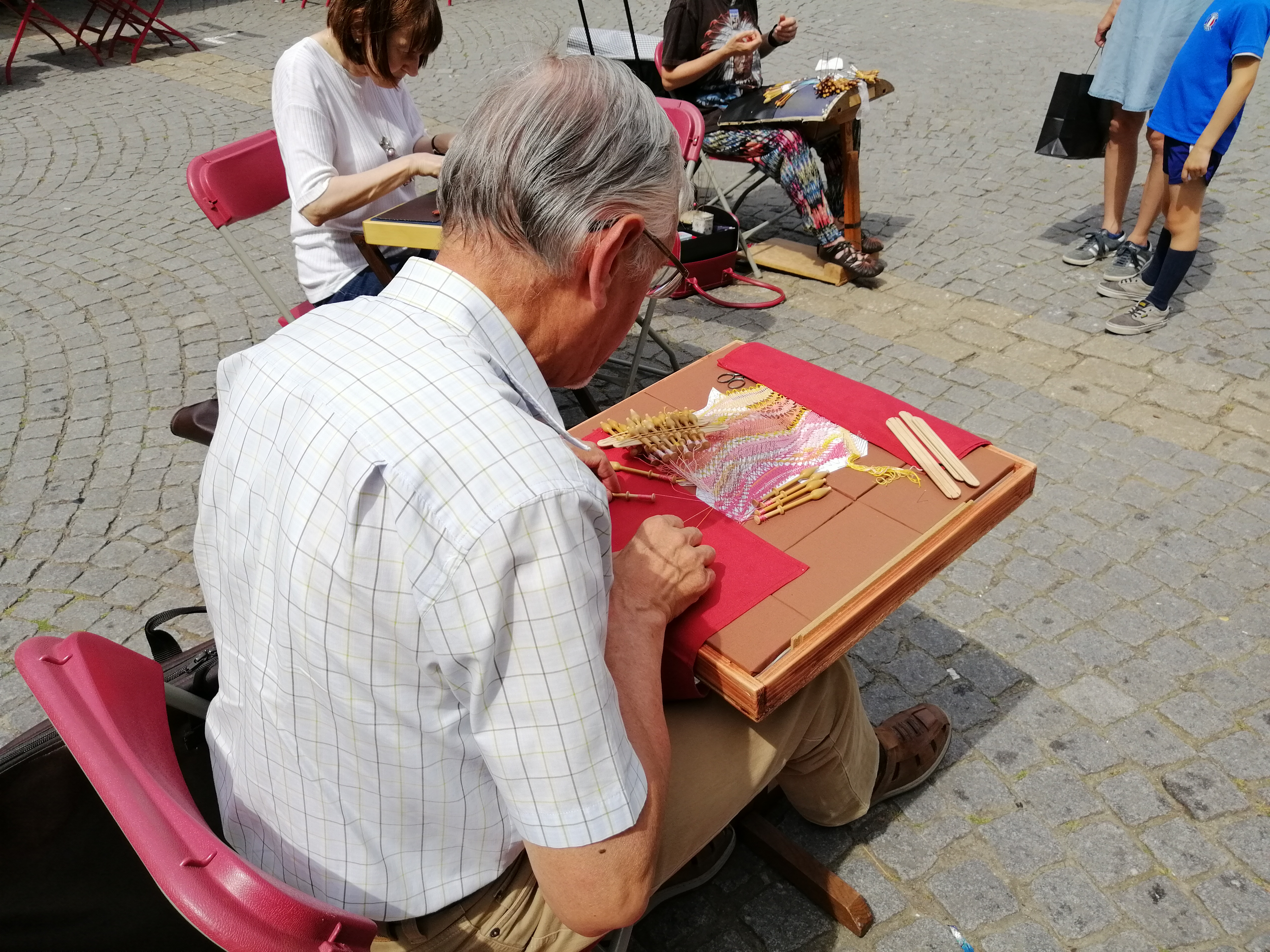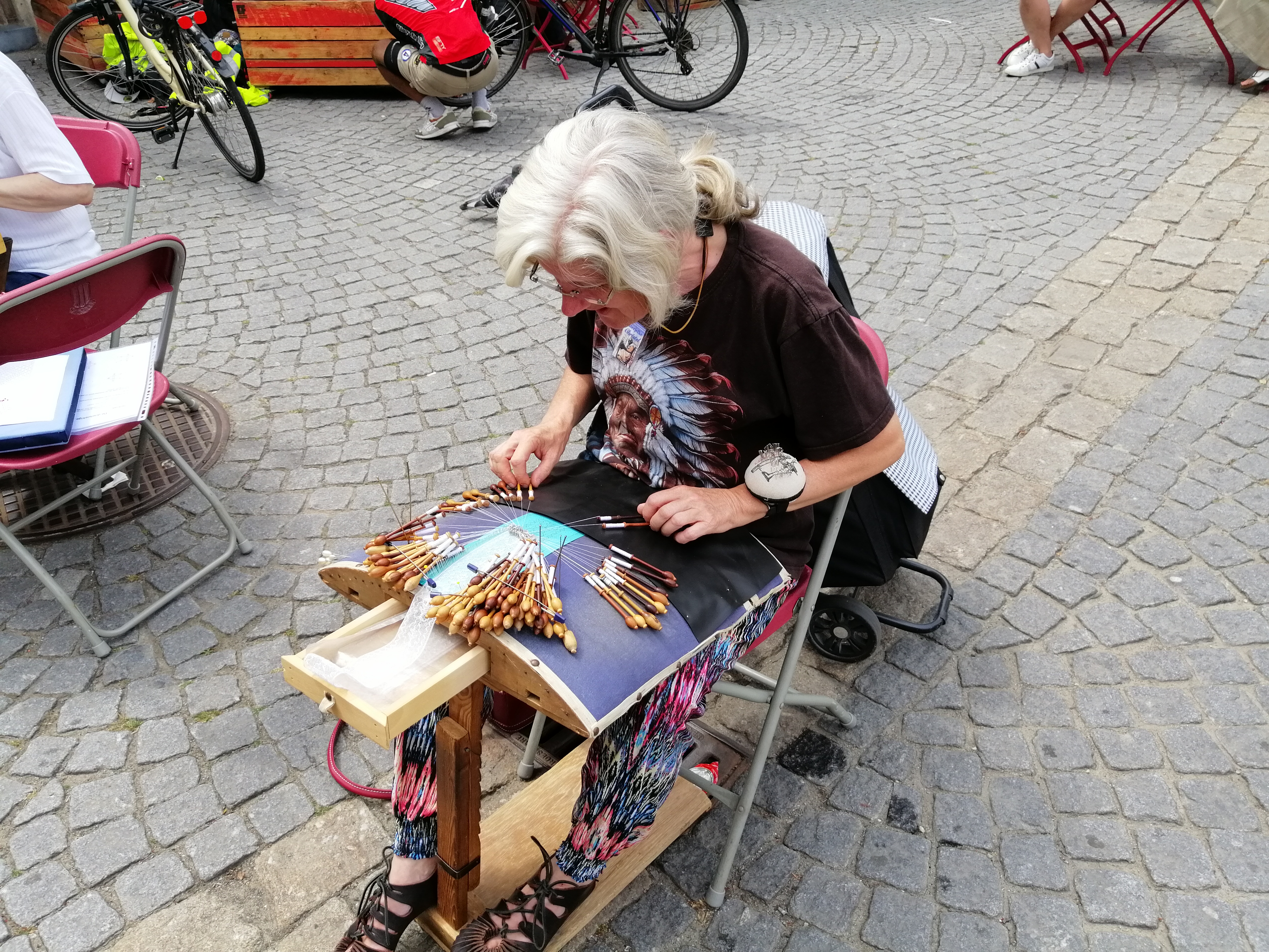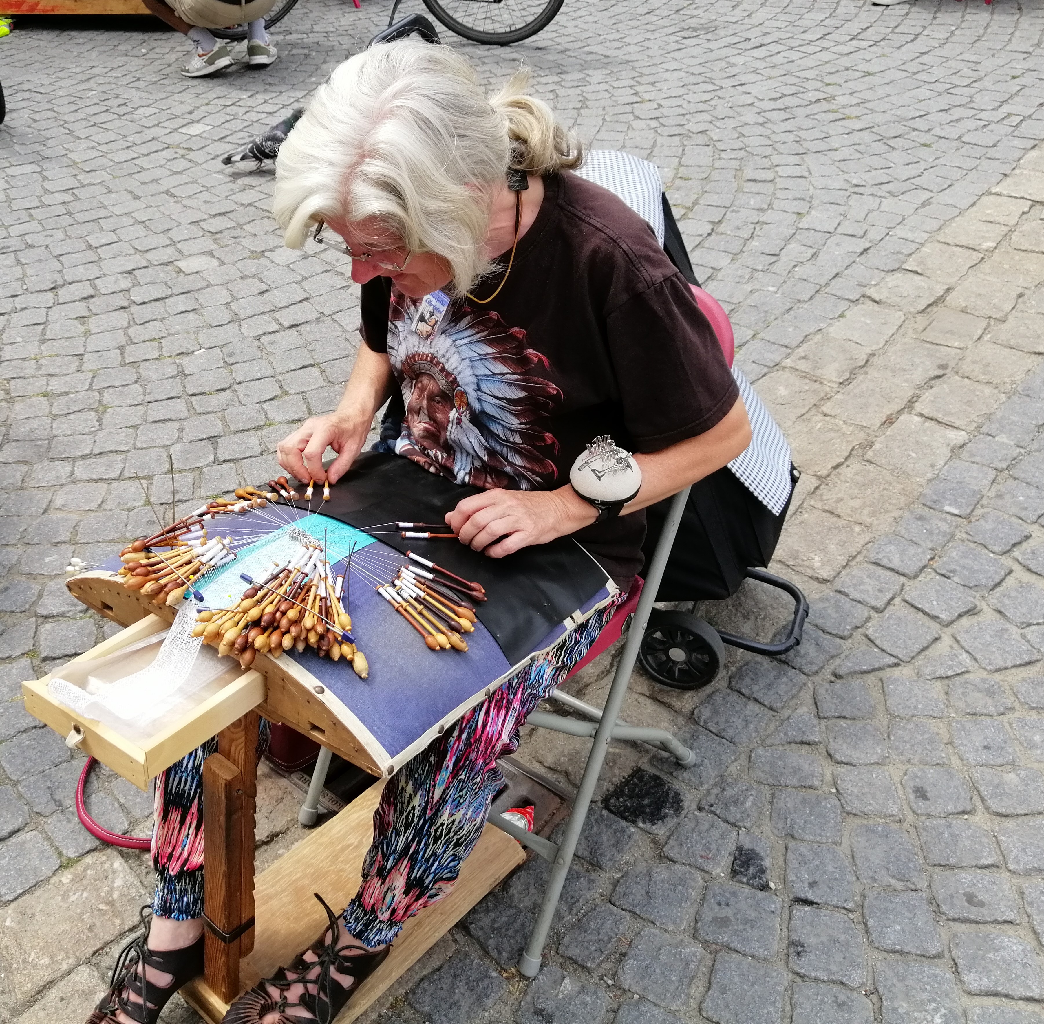 Ik heb verbaasd staan kijken hoe handig deze mensen met de kantklossen tussen de vingers de juiste bewegingen maken en hoe precies ze de sjablonen volgen.