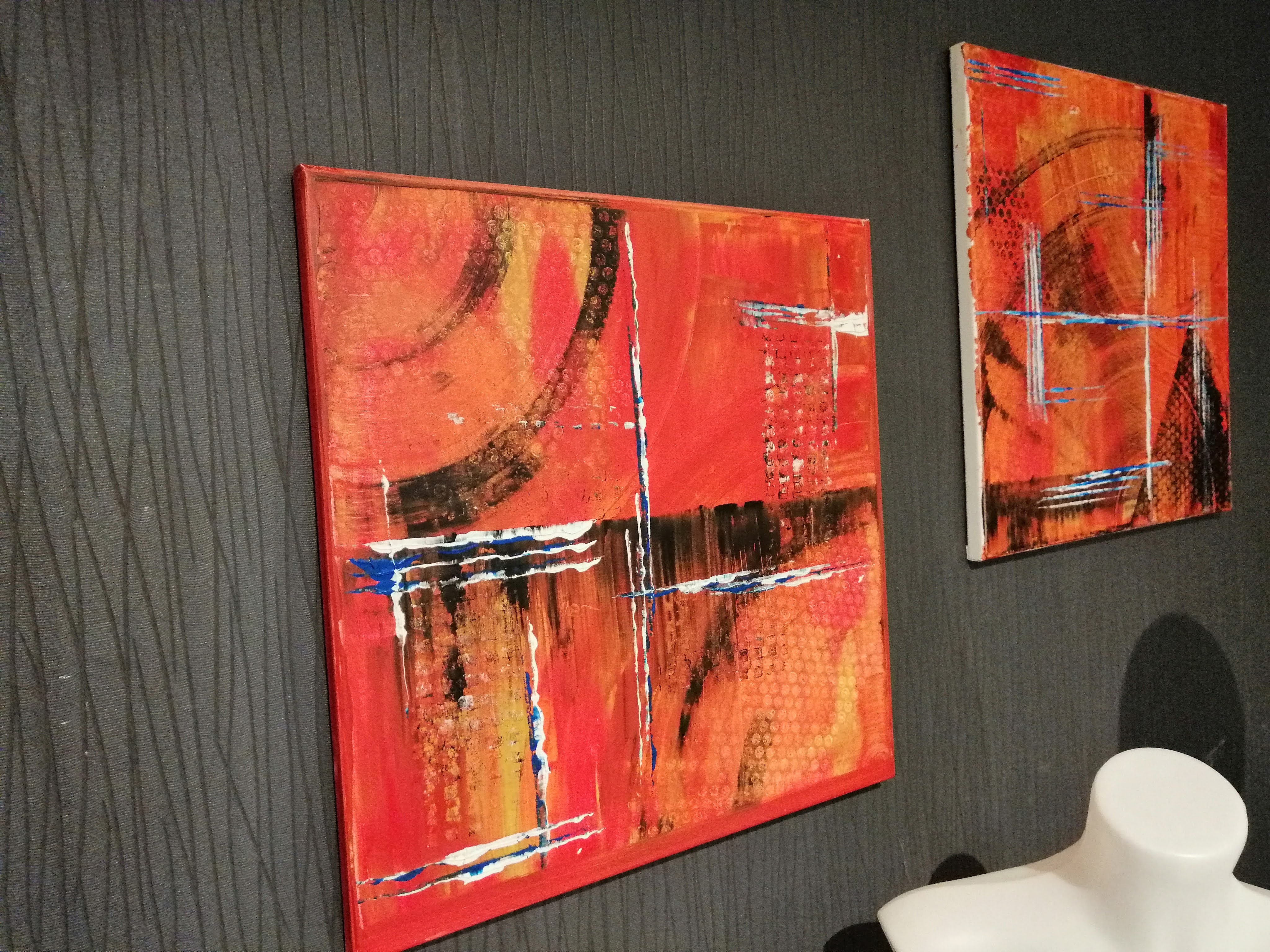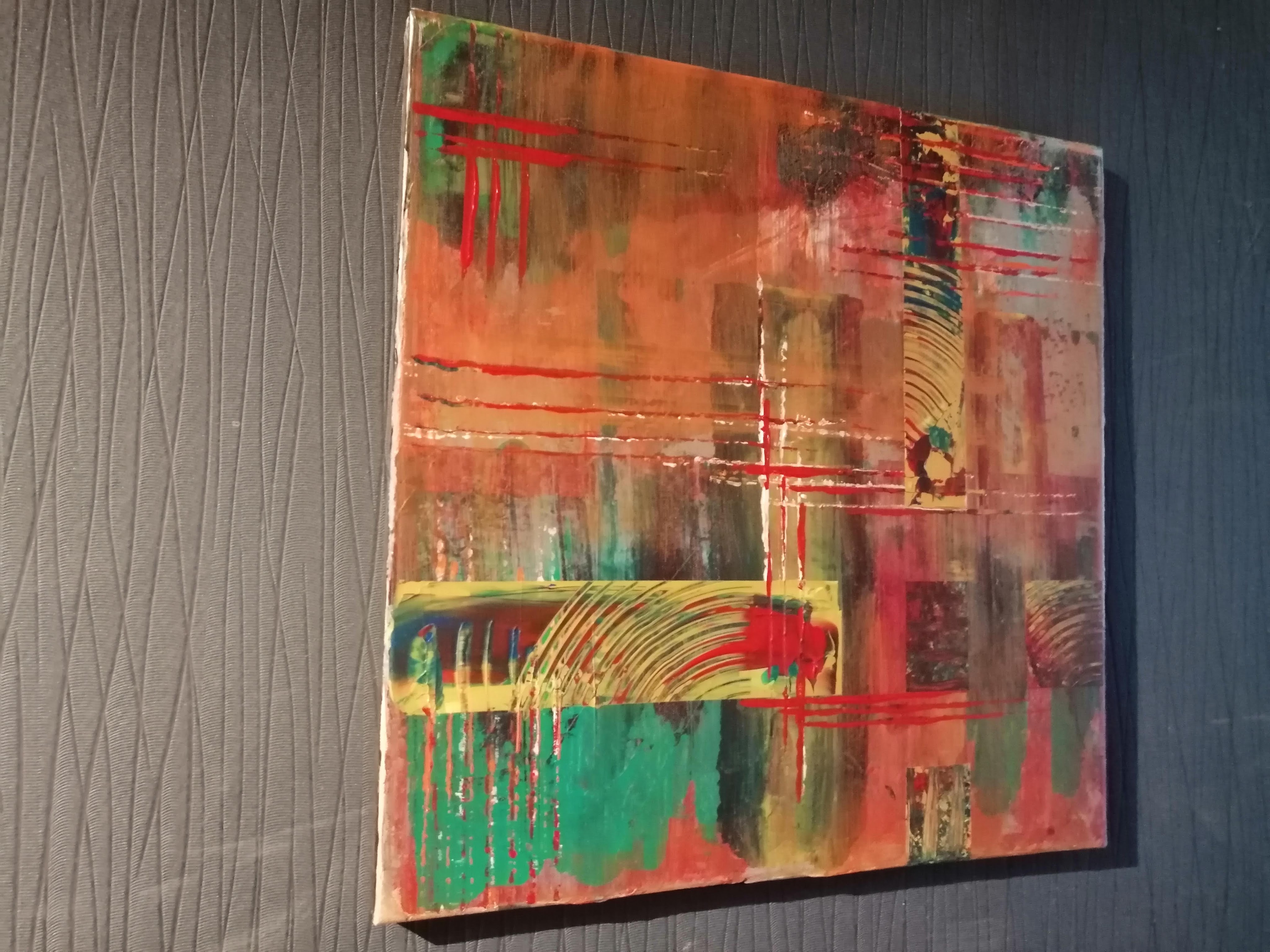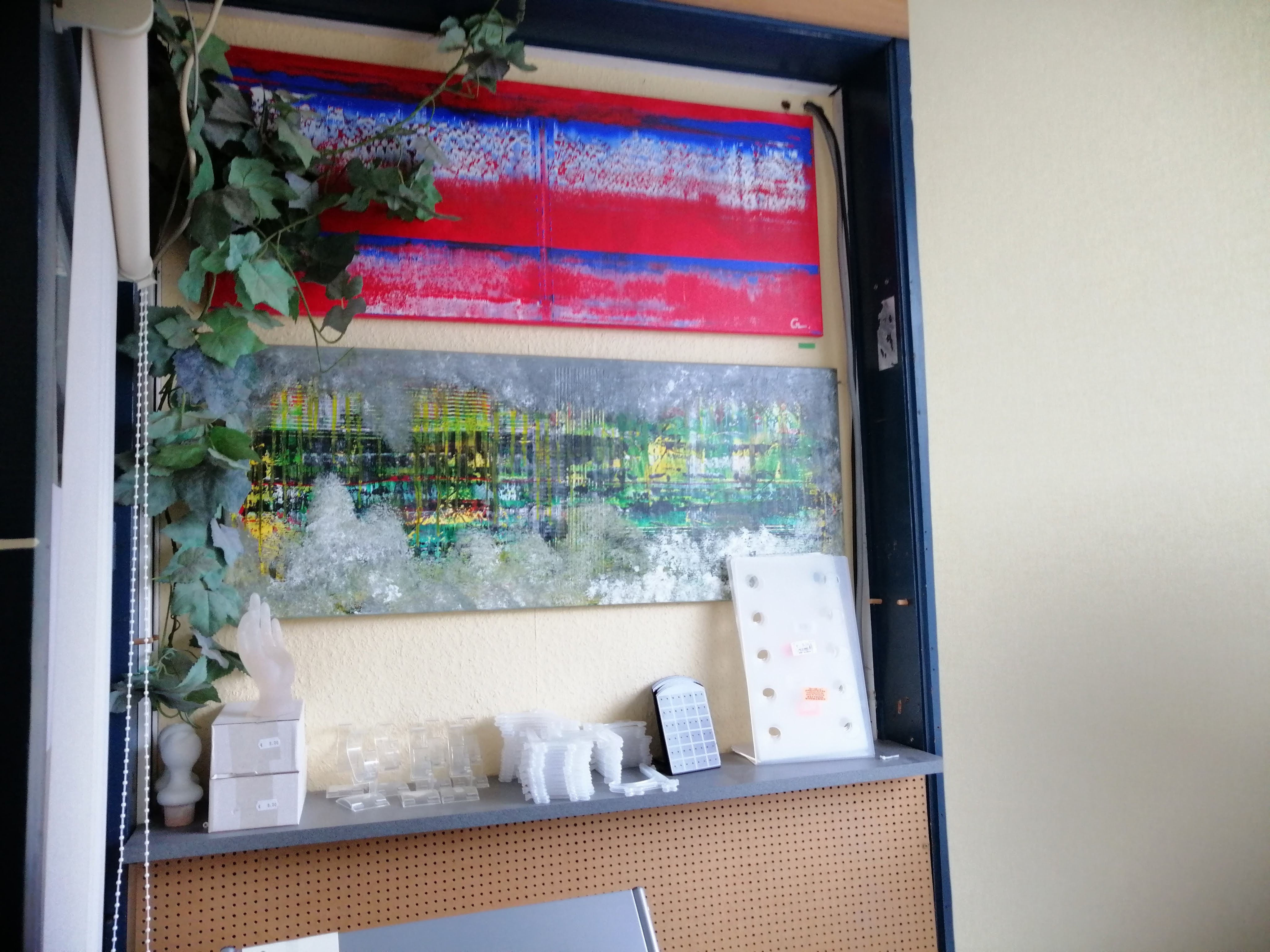 Op Youtube heb ik naar veel instructie video’s gekeken over het maken van schilderijen, en met mijn achtergrond als zelfstandig etaleur, heb ik wel heel wat ervaring met het maken van composities. En het is dan ook deze ervaring en techniek die me helpt om abstracte schilderijen te maken, en vooral ook te weten wanneer zo een schilderij af is. Dat laatste is niet zo evident voor een abstract schilderij.